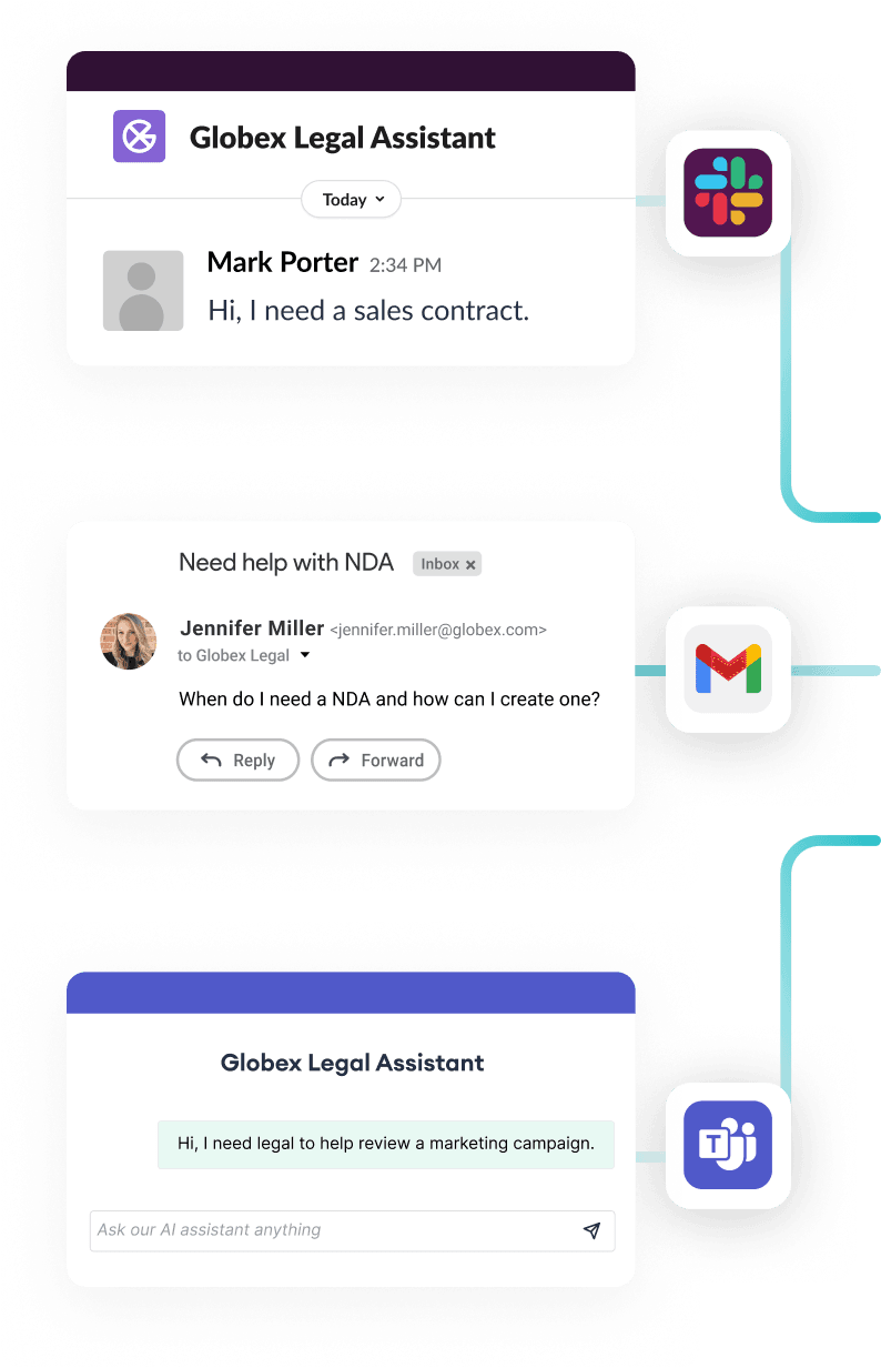 Requests are directed to a legal-specific channel e.g. legal@company.com inbox or #legal Slack / Teams channel.
